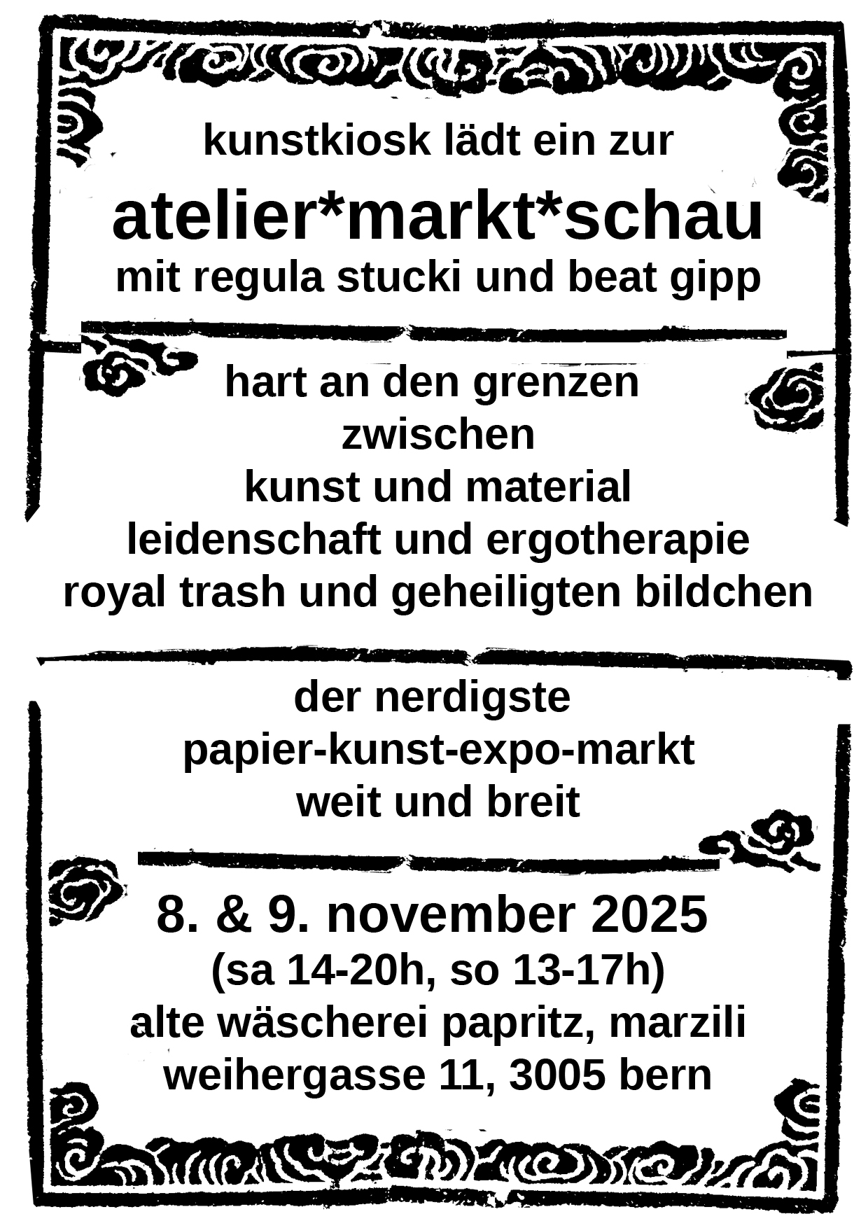 Beat Gipp und ich laden mal wieder zu einer Veranstaltung ein: wir bringen Material, Papier, Drucke und Schnipsel unter die Leute wie auch kleine Kunstgegenstände aus unserer Küche. Die Preise sind tief. Es wartet ein kleiner Barbetrieb und ein Mini-Flohmarkt. Was will man mehr? Wir freuen uns auf jede papierbegeisterte Besucherin und jeden Besucher.