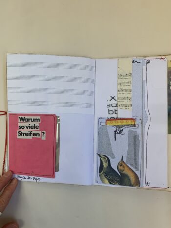 23 x 16,5 cm, 24 Seiten, 2023, mit vielen Klappen, Innenfächern und Verstecken, ergänzt mit zusätzlichen Papierelementen und Originalcollagen der Künstlerin.